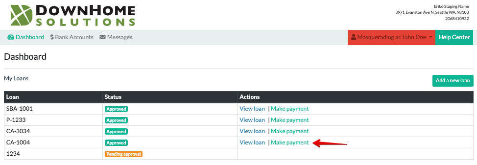 - From the Dashboard page, click "Make Payment" on your loan. If you have more than one loan, make sure to select the correct one.