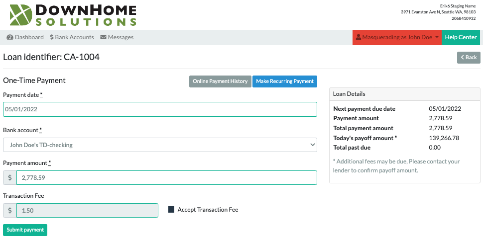 If you have questions about a payment, please contact your lender directly. You can find their contact information on the top of any page while logged in to your Online Portal.