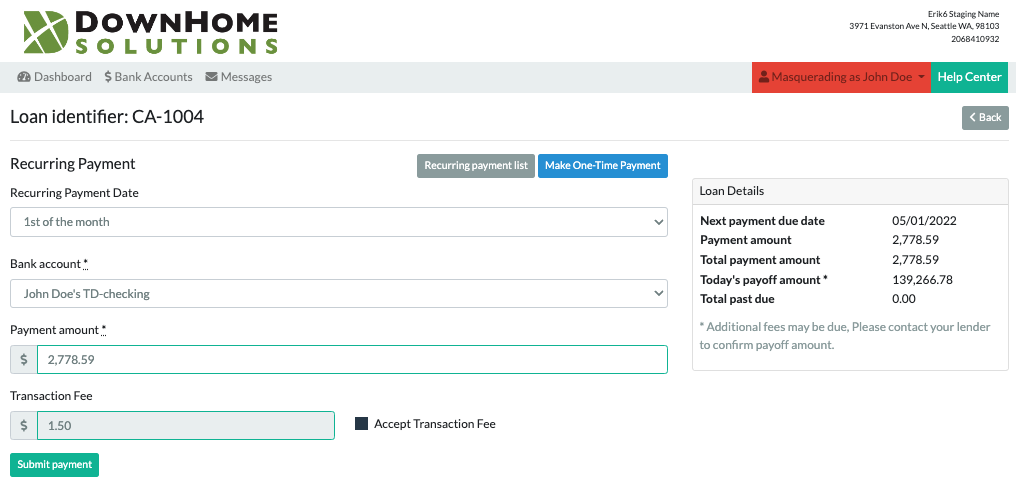 - Select a Recurring Payment Date. Options are defined by your lender. (e.g. “1st of the month”, “15th of the month”, etc.)