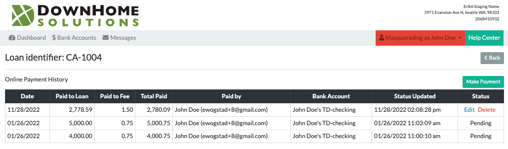 If you have questions about a payment, please contact your lender directly. You can find their contact information on the top of any page while logged in to your Online Portal