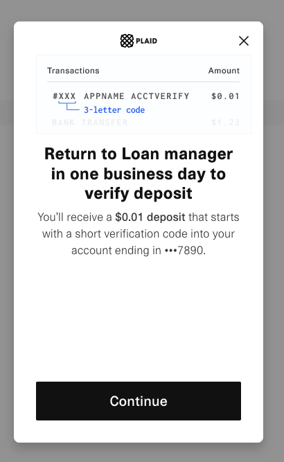 On the final screen, you will be prompted to authorize Plaid to make a deposit of $0.01 into your account. After authorizing, the screen should display a time estimate - some deposits arrive same-day, others can take up to two business days.